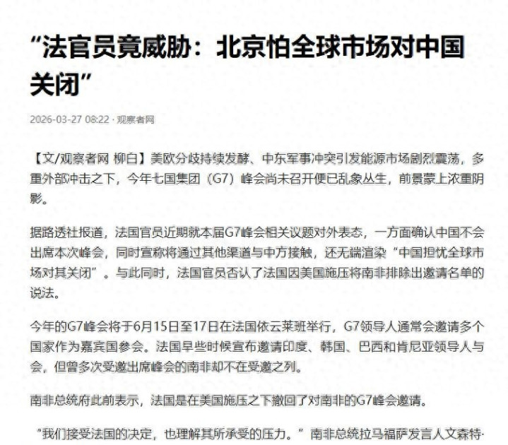 2026年3月26日,法国外交部正式说中国不参加G7外长会。同一天,网上疯传一张截图:法国驻华使馆内部邮件写着“中方拒绝一切协调安排”。但三天后,欧洲议会8年来第一次组团访华,飞机3月31号落地北京。更早前,马克龙去年12月第四次来中国,签了18份合作文件。这些事都没上热搜,但全是真的。
