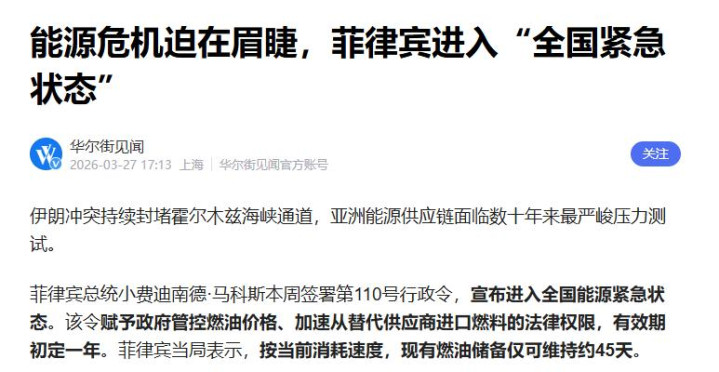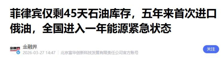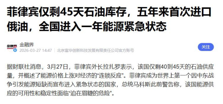 随着中东战事不断,菲律宾深陷能源困局,总统马科斯陷入两难境地,不得不放下姿态,同时向中国和俄罗斯发出求援信号。